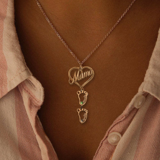 Personalized Heart Pendant Birthstones Necklace with BabyFeet Charms